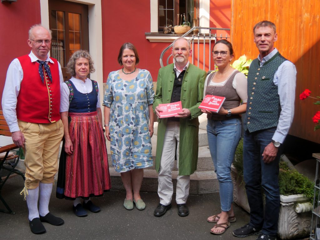 Die ARGE Fränkische Volksmusik stellt ihr neues und letztes Heft „Lieder aus Franken“ vor. Es wird offiziell am 9. September im Bayerischen Rundfunk sowie am 14. September beim Unterfränkischen Volksmusikfest in Ostheim vor der Rhön vorgestellt. Von links: ARGE-Schatzmeister Peter Wüst und seine Stellvertreterin Sibylle Schwab, Schriftführerin Birgit Speckle vom Sachgebiet Musik, Theater und Heimatpflege beim Bezirk Unterfranken, Beirat und Berater Armin Griebel sowie die zwei Vorsitzenden Inka Pfister und Burkard Schmitt.